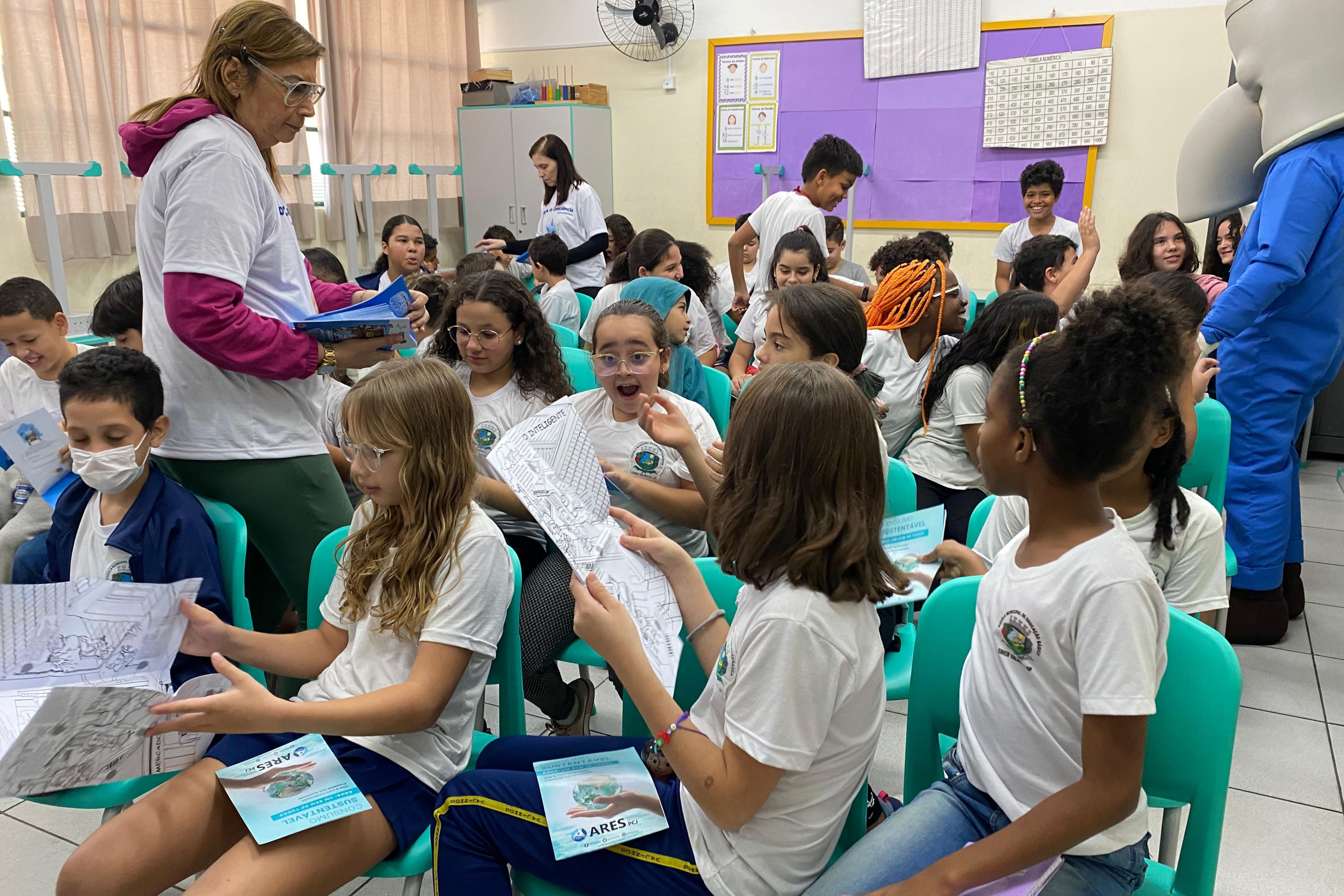 Os alunos receberam cartilhas educativas e interativas, além de copos personalizados do DAEV.