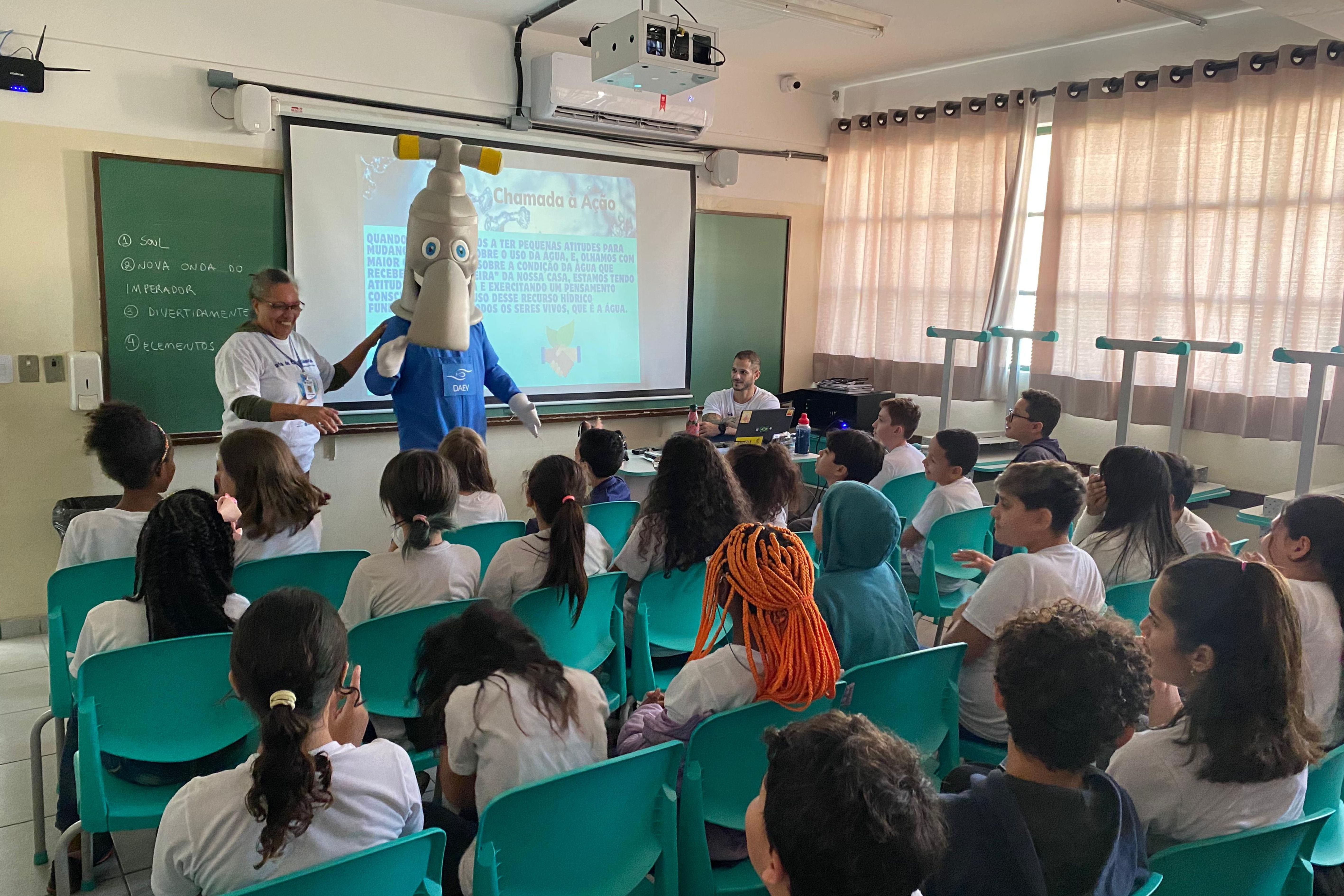 Com a presença da mascote Torneirinha e através de um conteúdo didático, os estudantes aprenderam que a água é fundamental para a vida humana e quais são as formas simples de economizar o recurso hídrico em casa, principalmente no período de estiagem.