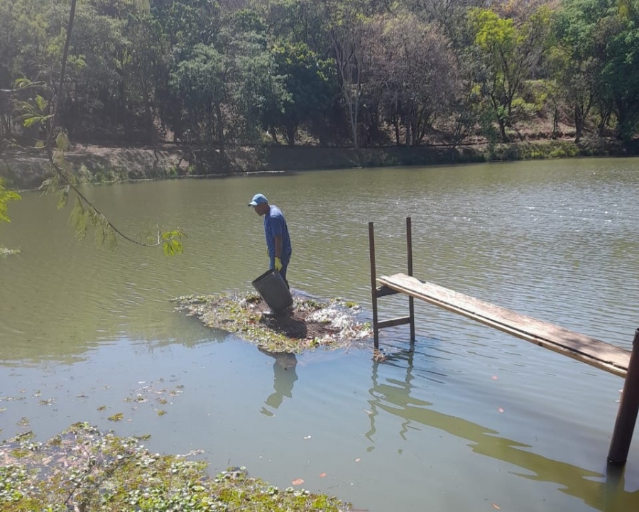 Trabalho preventivo foi realizado no último sábado nos lagos do Peixe & Cia e do Parque dos Lagos, com objetivo de conter as plantas aquáticas